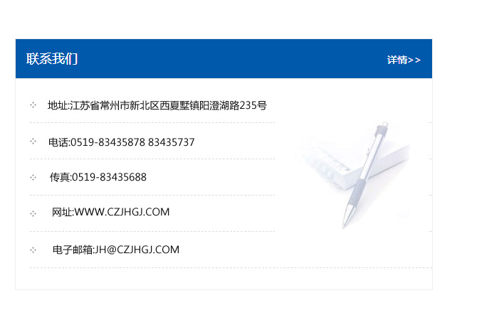 傳真:0519-83435688    郵編:213135    網址:WWW.czjhgj_com.iksnail.com    電子郵箱:JH@czjhgj_com.iksnail.com